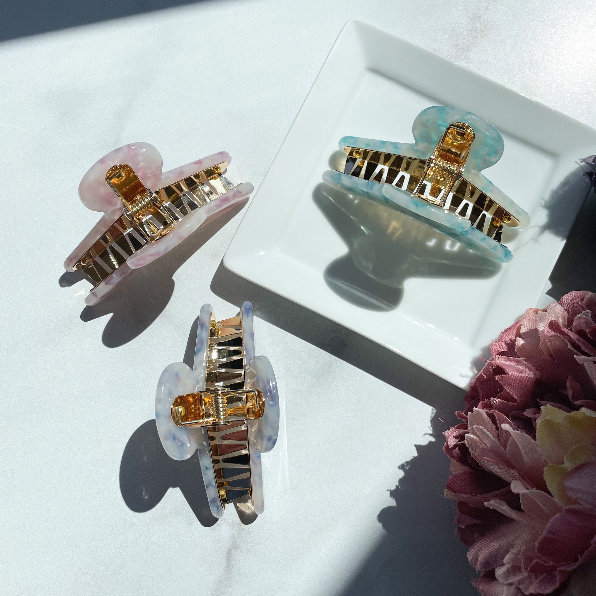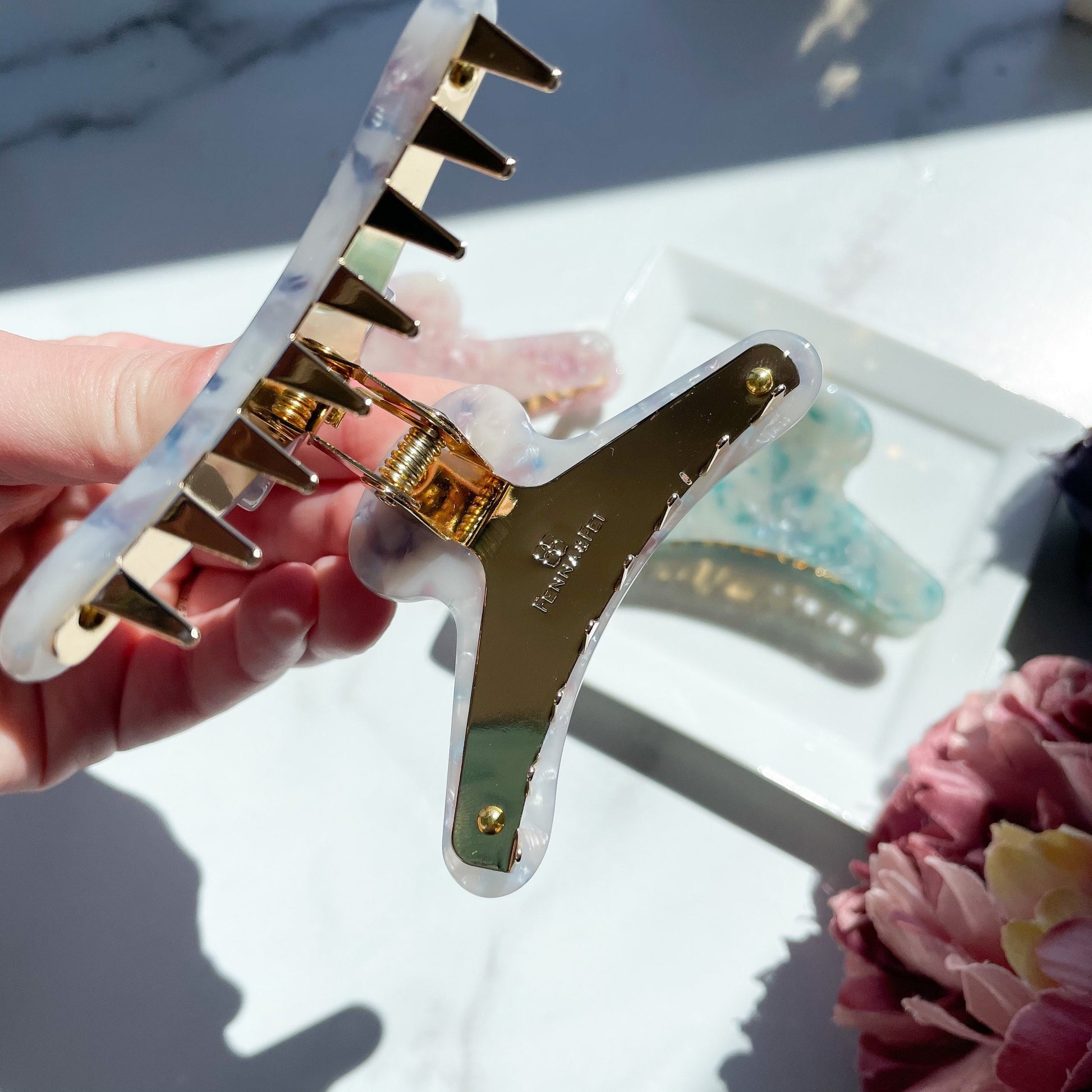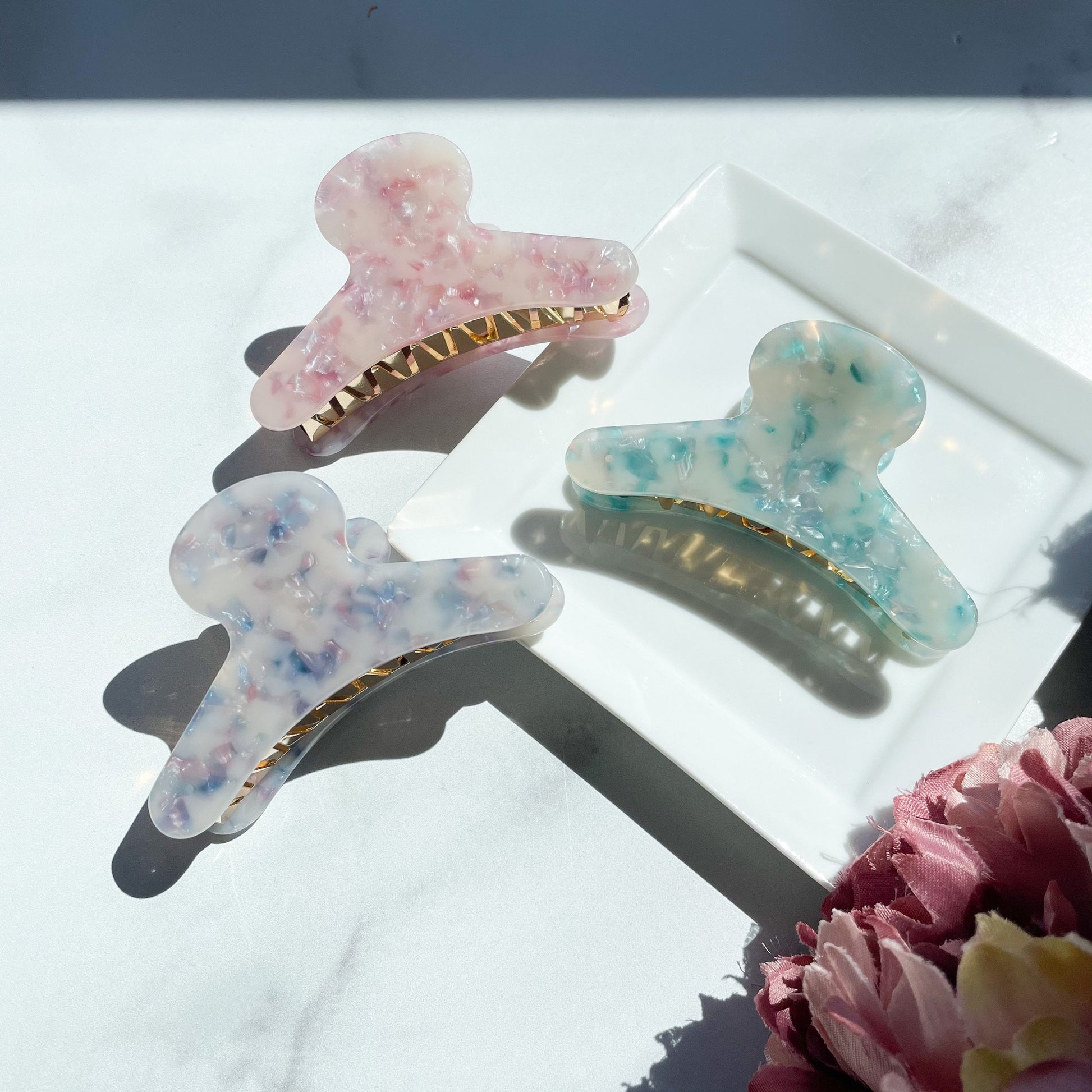Our French claws are sturdy and unique. Made with our custom acetate and stainless steel these claws are sturdy and beautiful. These claws are best suited for medium thickness for a full French knot to be achieved.