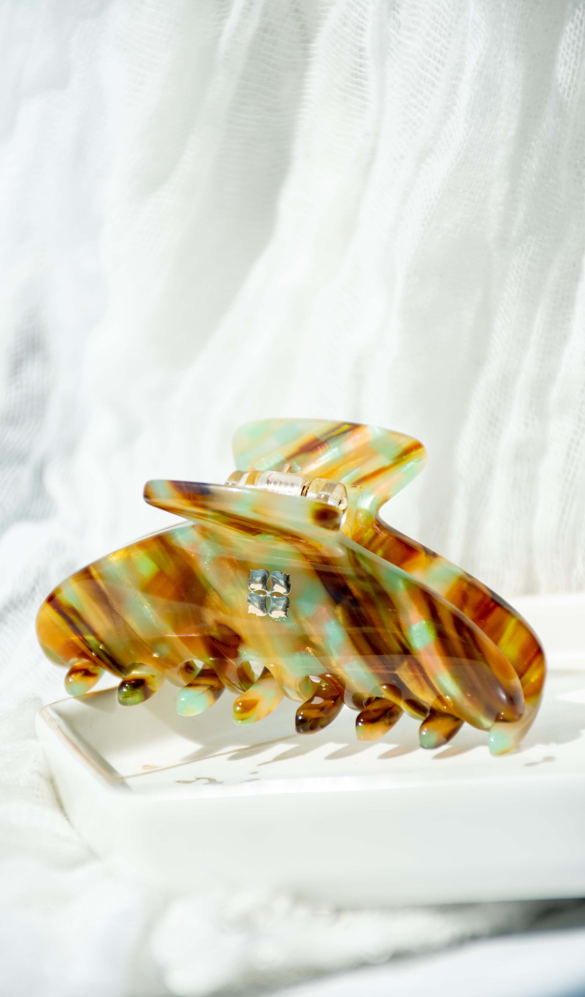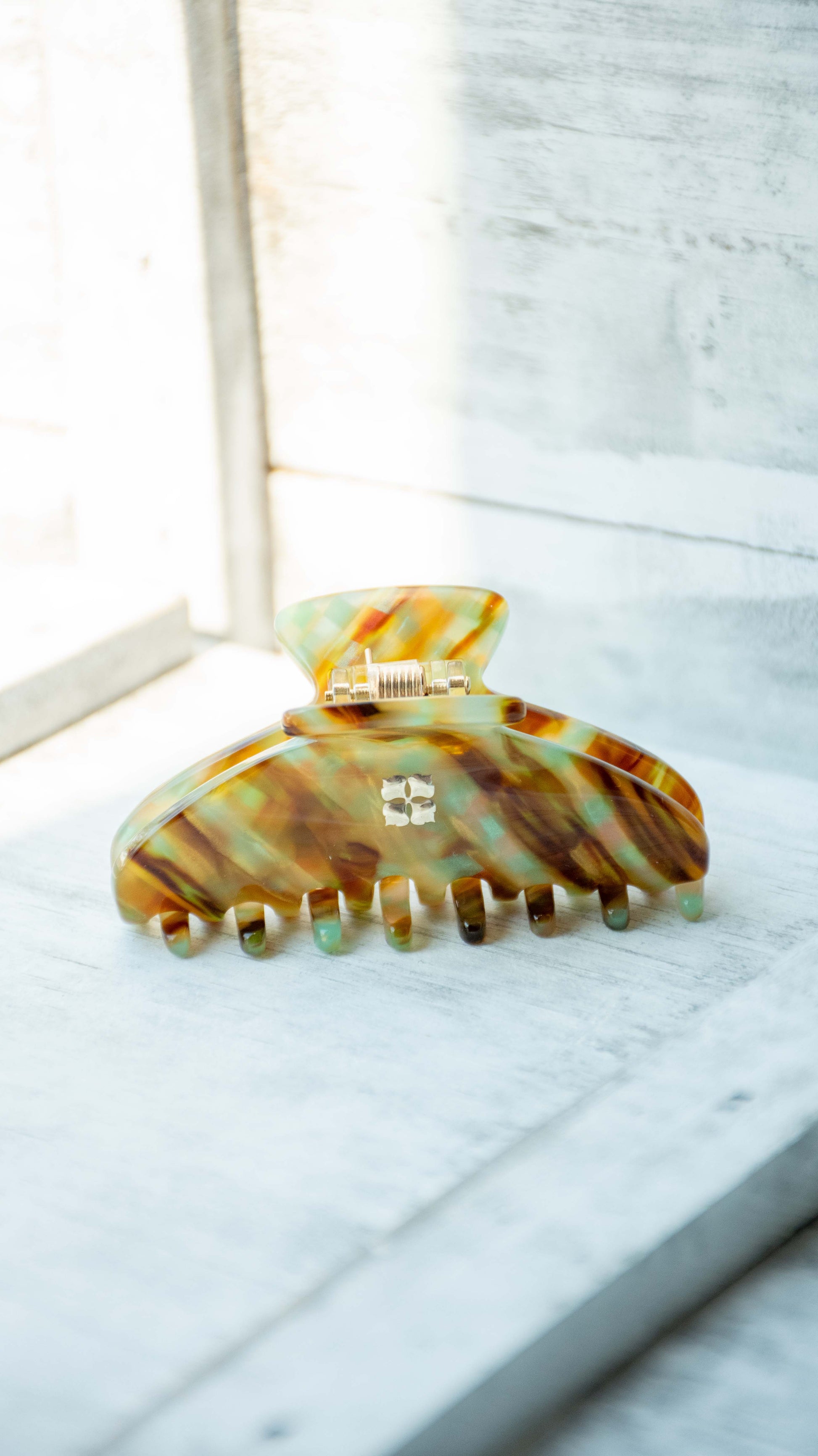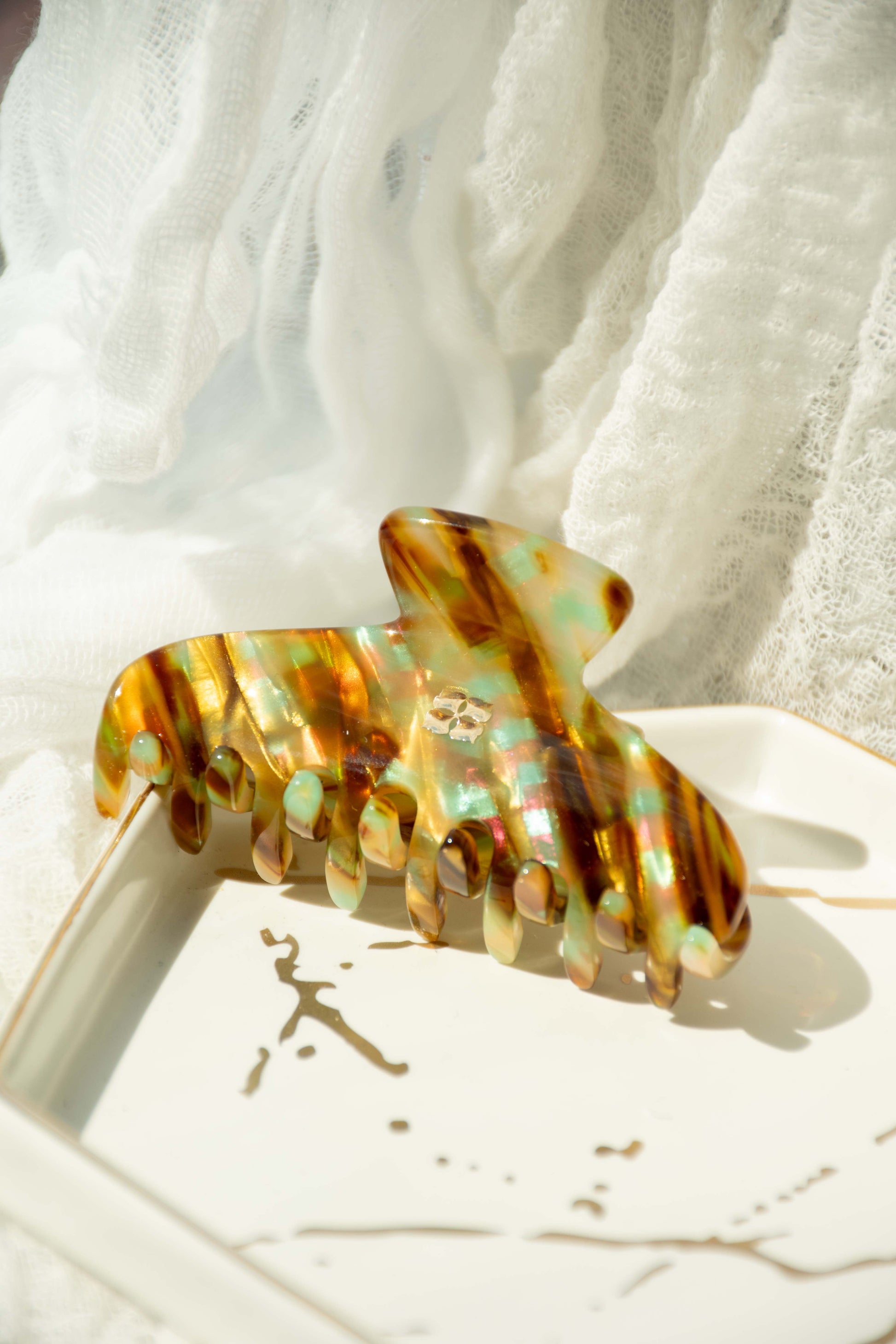 Glamour Grip Mini Claw in Fools Gold | Bronze Gold Teal Glamour Grip | Italian Acetate Tortoise Shell Small Hair Clip