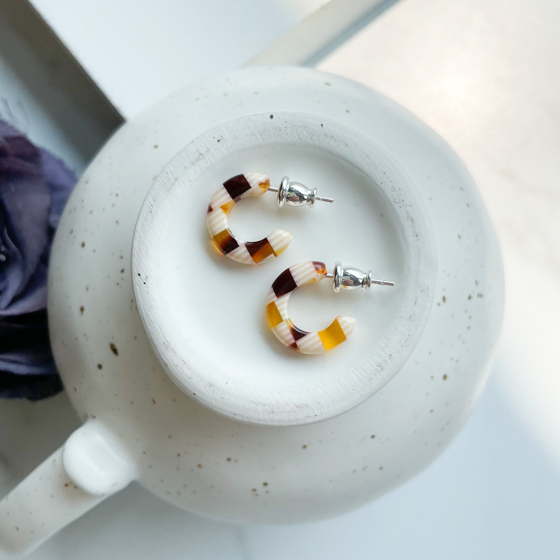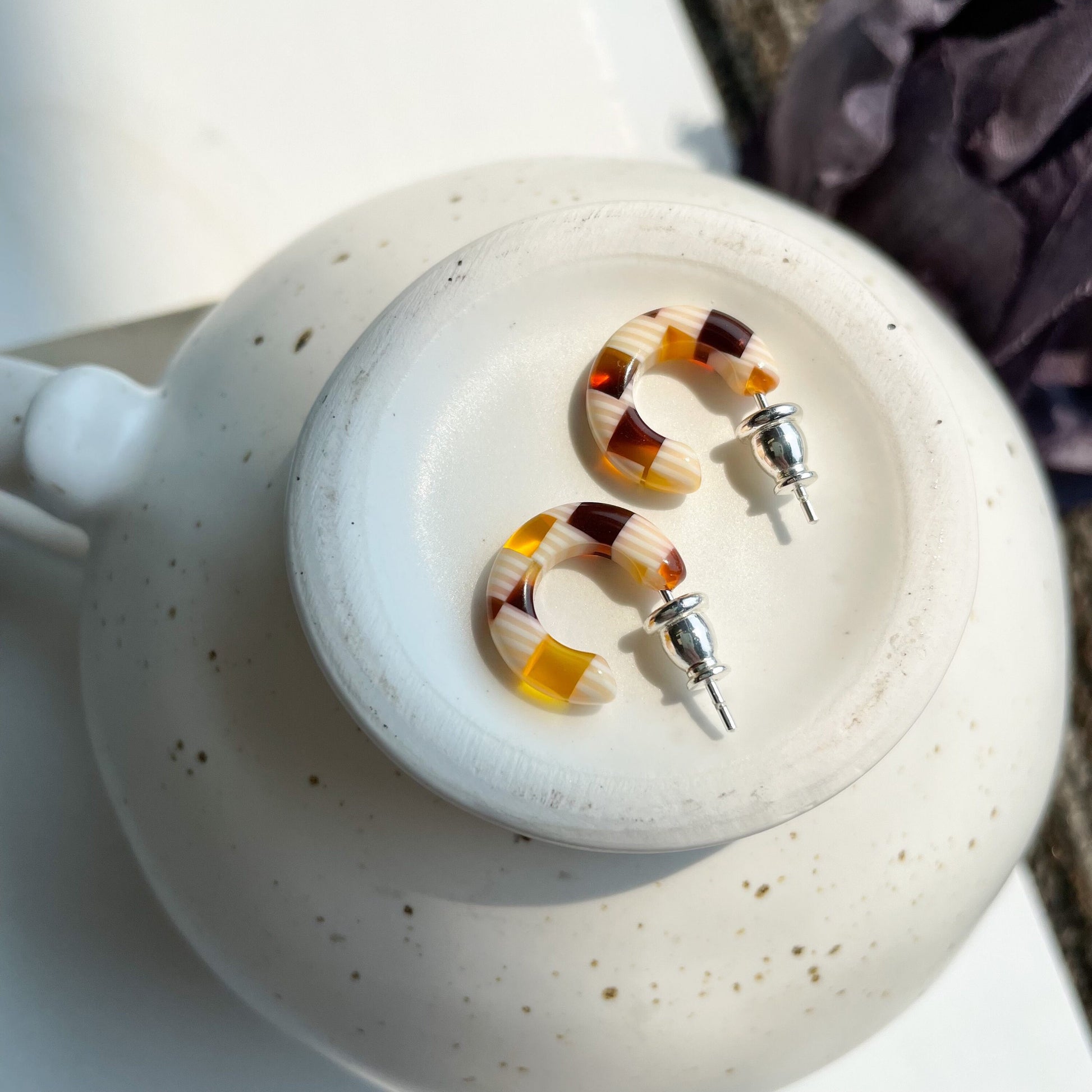 Huggie Hoops in Tetris | Tiny Small Orange and White Checkered Hoop Earrings 925 Sterling Silver Posts