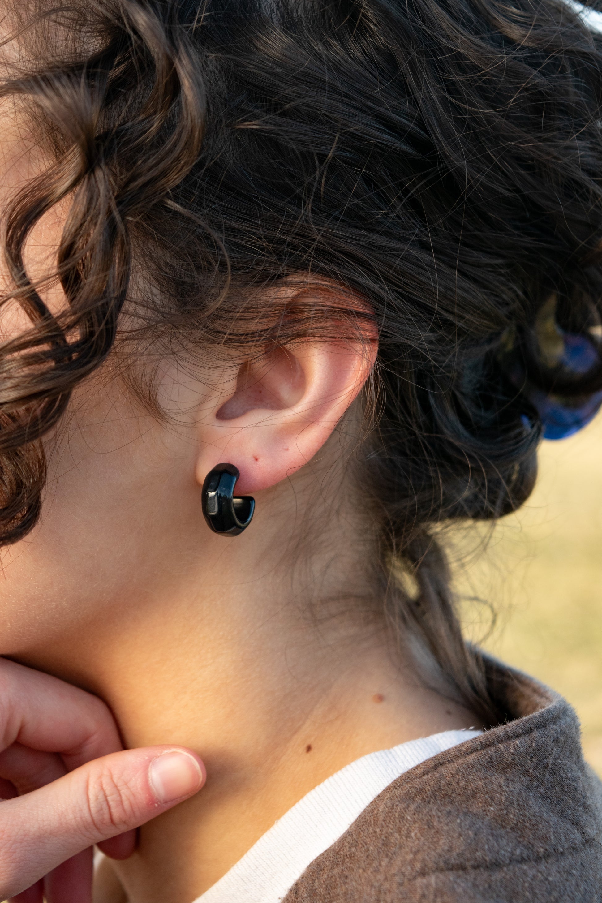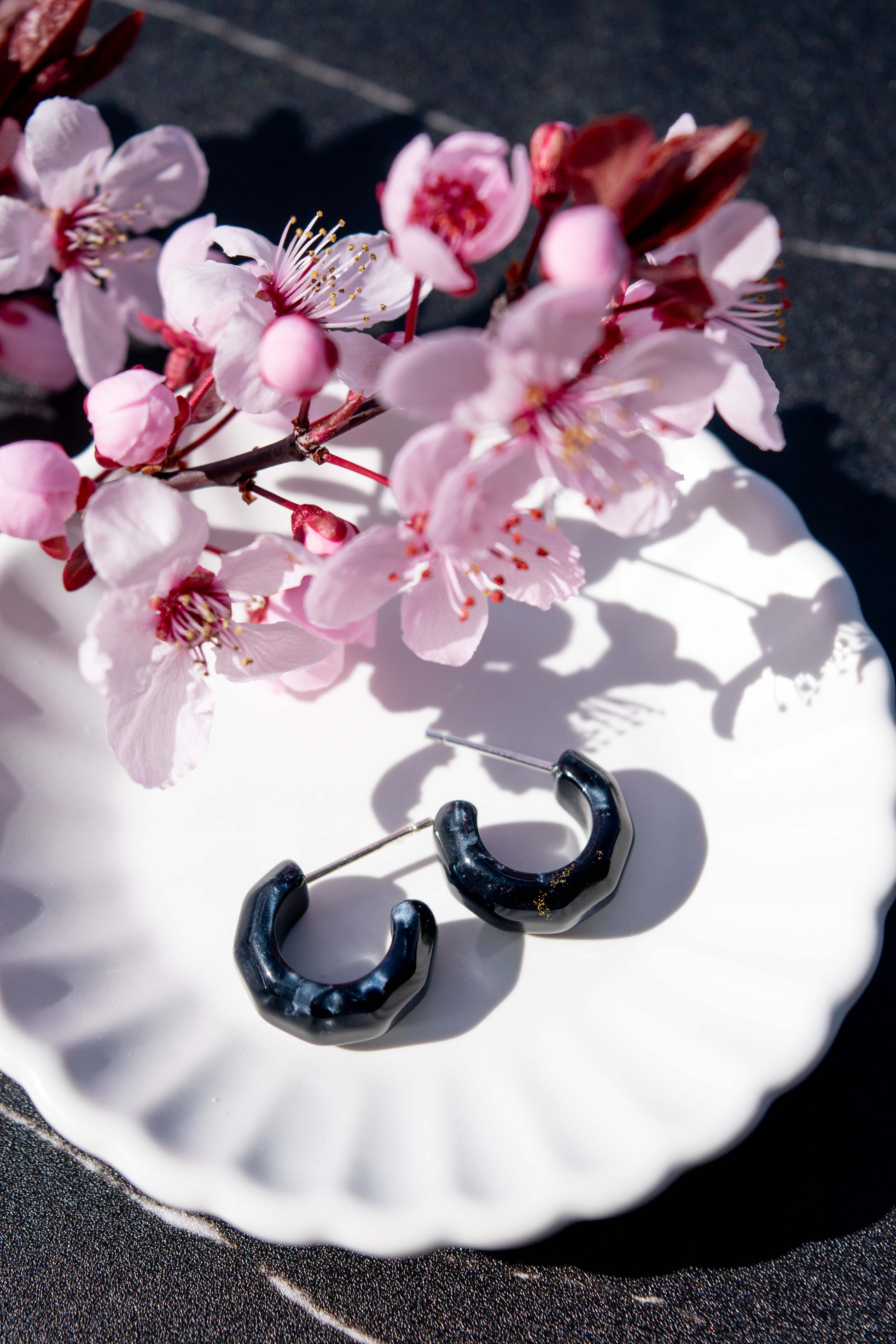 Kaleidoscope Hoops in Black Pearl | Geometric Acetate Resin Huggie Hoop Earrings Sterling Silver Posts Men’s Unisex