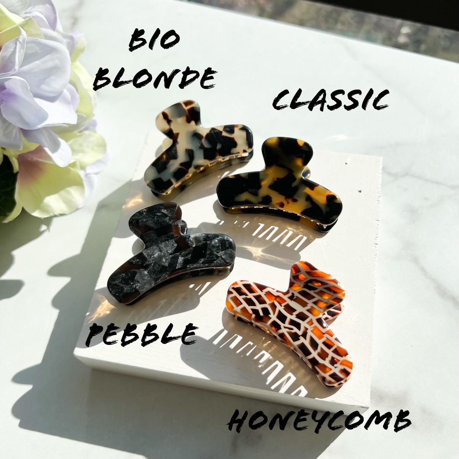 These mini 2.5 inch French claws are super lightweight and have impeccable grip. Great for all day wear! The teeth are made from stainless steel rust-free metal and have a gold colored finish. The outer layer is Italian cellulose acetate. Each claw is packaged in it's own recycled material bag. Each order receives one polishing cloth. This product is nickel free.